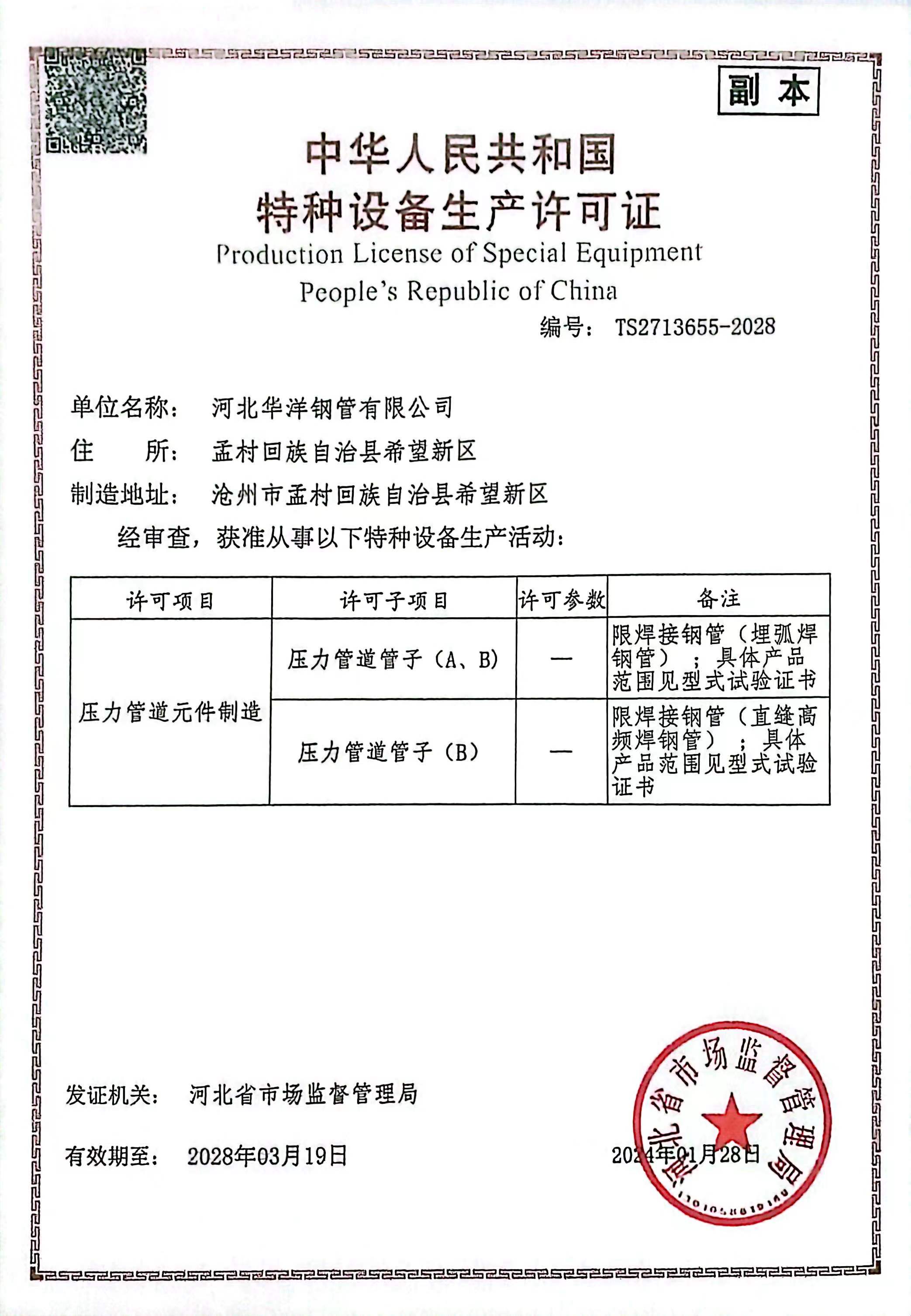 公司現(xiàn)有17條新型的自動(dòng)化鋼管生產(chǎn)線,包括Φ73-660.4高頻直縫焊鋼管生產(chǎn)線14條、Φ406.4-Φ1422.4直縫雙面埋弧焊鋼管生產(chǎn)線3條,并配備有一條防腐生產(chǎn)線,可進(jìn)行3PE、2PE、FBE、2PP、3PP防腐處理,同時(shí)還可提供鋼管深加工服務(wù)。公司擁有先進(jìn)的理化實(shí)驗(yàn)室,可承擔(dān)鋼管的各項(xiàng)物理及化學(xué)檢測(cè)與試驗(yàn)。公司先后取得了ISO9001質(zhì)量管理體系認(rèn)證、ISO14001環(huán)境管理體系認(rèn)證、ISO45001職業(yè)健康安全管理體系認(rèn)證、特種設(shè)備制造許可證、API5L和API2B認(rèn)證證書(shū)、歐盟CE認(rèn)證、俄羅斯GOST認(rèn)證、中海油入網(wǎng)證、安全生產(chǎn)標(biāo)準(zhǔn)化二級(jí)企業(yè)等標(biāo)準(zhǔn)質(zhì)量體系認(rèn)證。